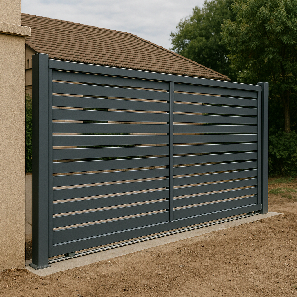 A fully welded steel sliding gate with a clean modern design and powder-coated finish.